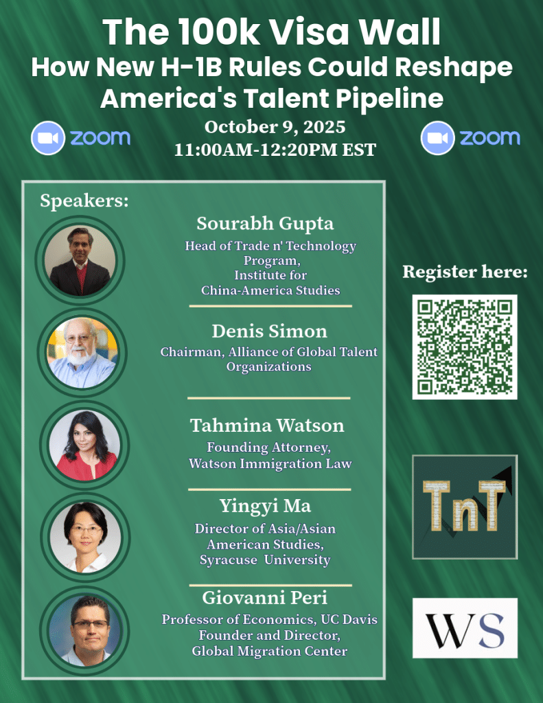 Our partner Institute for China-American Studies based in Washington DC is organizing a webinar titled “The 100k Visa Wall: How New H-1B Rules Could Reshape America’s Talent Pipeline”.