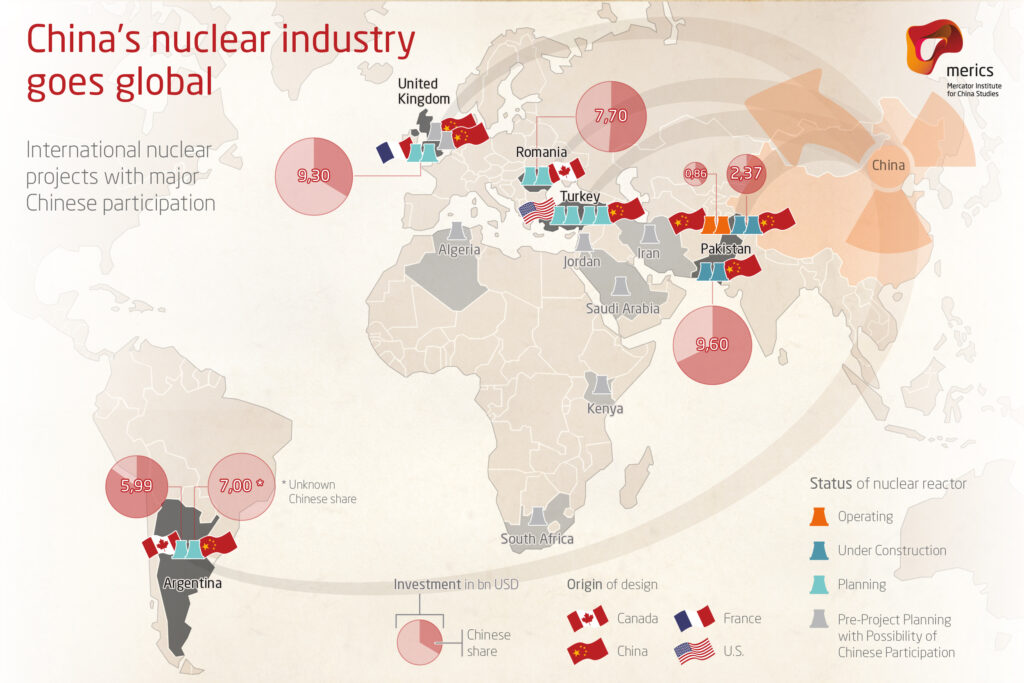 A European nuclear plant built and operated by China? Unimaginable, one might say, as China still has to prove to be a reliable partner in operating critical infrastructure, meeting strict safety requirements, and managing the complex technology. Yet, nuclear reactors are about to be built with Chinese participation in the United Kingdom. And that is just the beginning. Chinese power corporations are initiating new projects all over the globe and have the potential to become the next big civil nuclear technology suppliers for several countries (see the map below). As this trend is assuming shape, the next decade will be critical to ensure that Chinese technology is safe and that China adheres to non-proliferation agreements.