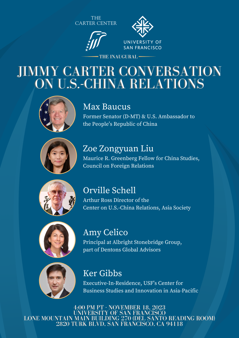Join the Carter Center for the inaugural Jimmy Carter Conversation on U.S.-China Relations hosted in partnership with the University of San Francisco’s Center for Business Studies and Innovation in Asia-Pacific. Our speakers will debate and discuss the legacy of U.S.-China relations and how to peacefully manage the most consequential bilateral relationship in the world.